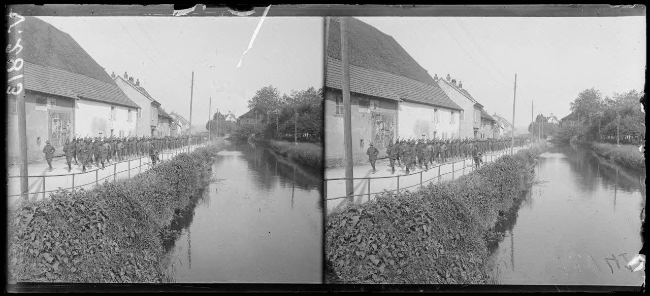 - Dans le village de Grandvillars (Territoire de Belfort, 30/05/1918, V 2790 à V 2814), les soldats du 370e RIUS (régiment d'infanterie américain) sont stationnés dans la ville. Cette unité de l'armée américaine appartient à la 93rd Infantry Division (93e division d'infanterie américaine) surnommée "Les casques bleus" (en raison du casque Adrian) et composée exclusivement de soldats afro-américains et portoricains. Une revue de la garde est effectuée, puis la fanfare du régiment joue sur la place. Le chef de corps, le colonel Franklin A. Denison, est présent. Le soldats font des mouvements de gymnastique, courant dans les rues de la ville avec leur fusil (Lebel Berthier Mle 1907/1915).