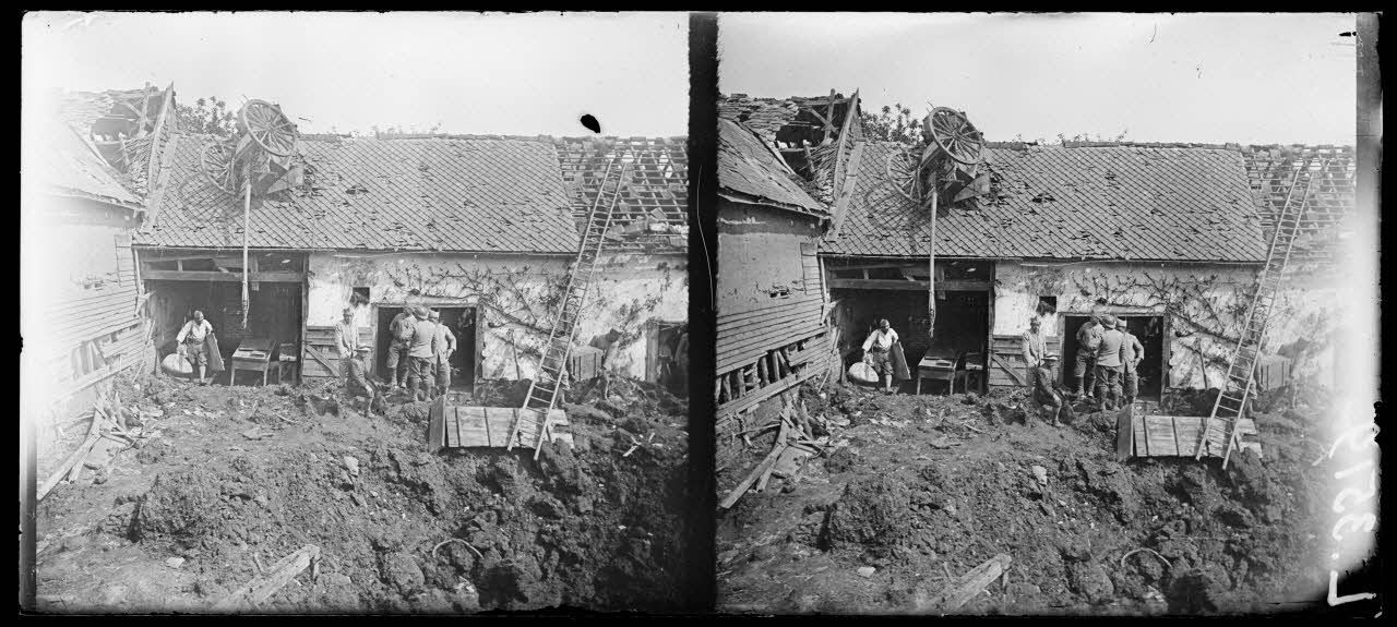 - à Grandvilliers, une voiture régimentaire projetée sur un toit suite à l'explosion d'une bombe, le cratère provoquée par l'explosion (SPA 75 L 3517/3519/3520), le marché aux chevaux en activité (SPA 75 L 3518).