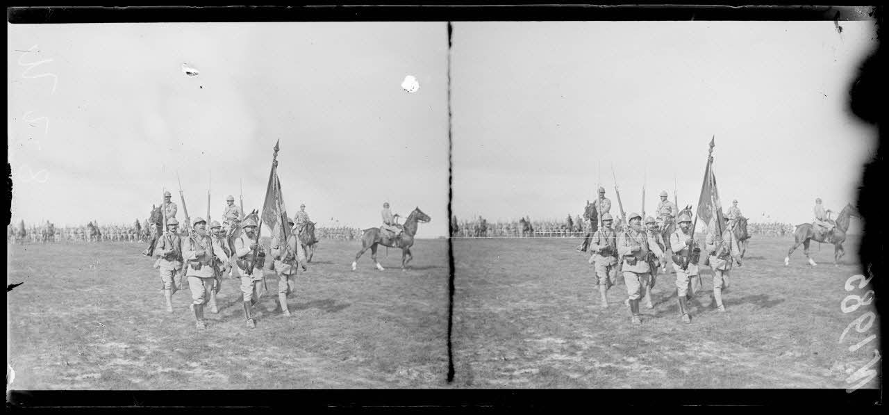 Gravelines (Marne). Revue de la 163e division par le général Gouraud. Le défilé, un drapeau. [légende d'origine]