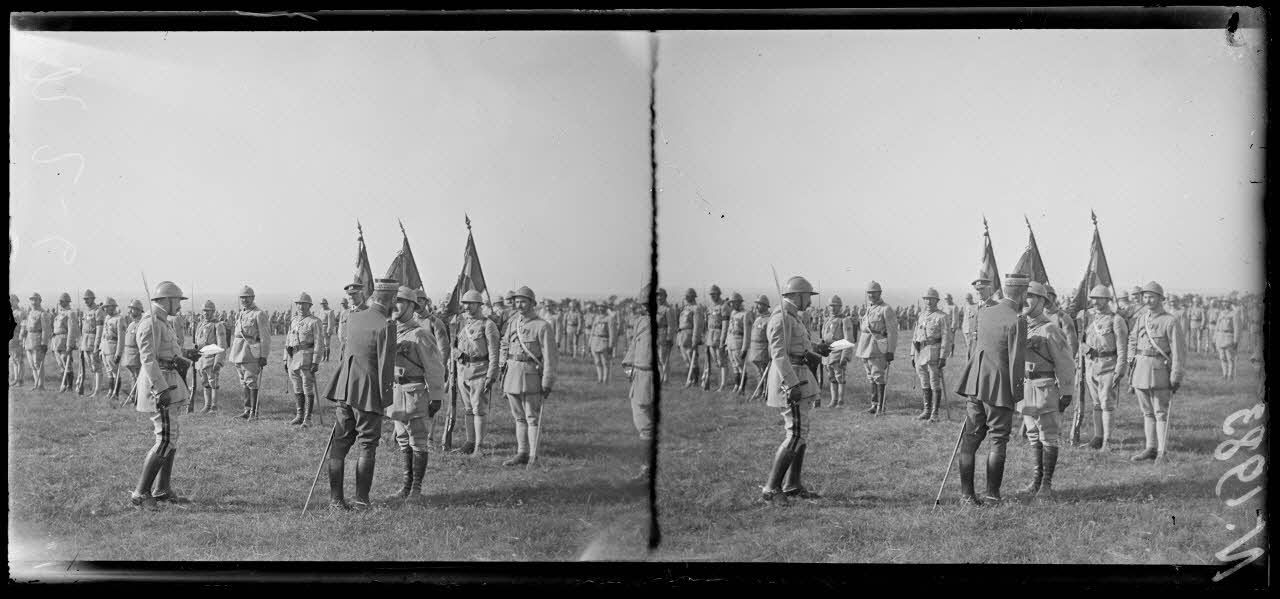 Gravelines (Marne). Revue de la 163e division par le général Gouraud. Le colonel Rozière du 142e fait commandeur de la légion d'honneur.
