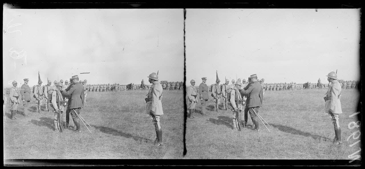 Gravelines (Marne). Revue de la 163e division par le général Gouraud. Le général Gouraud remet des décorations.
