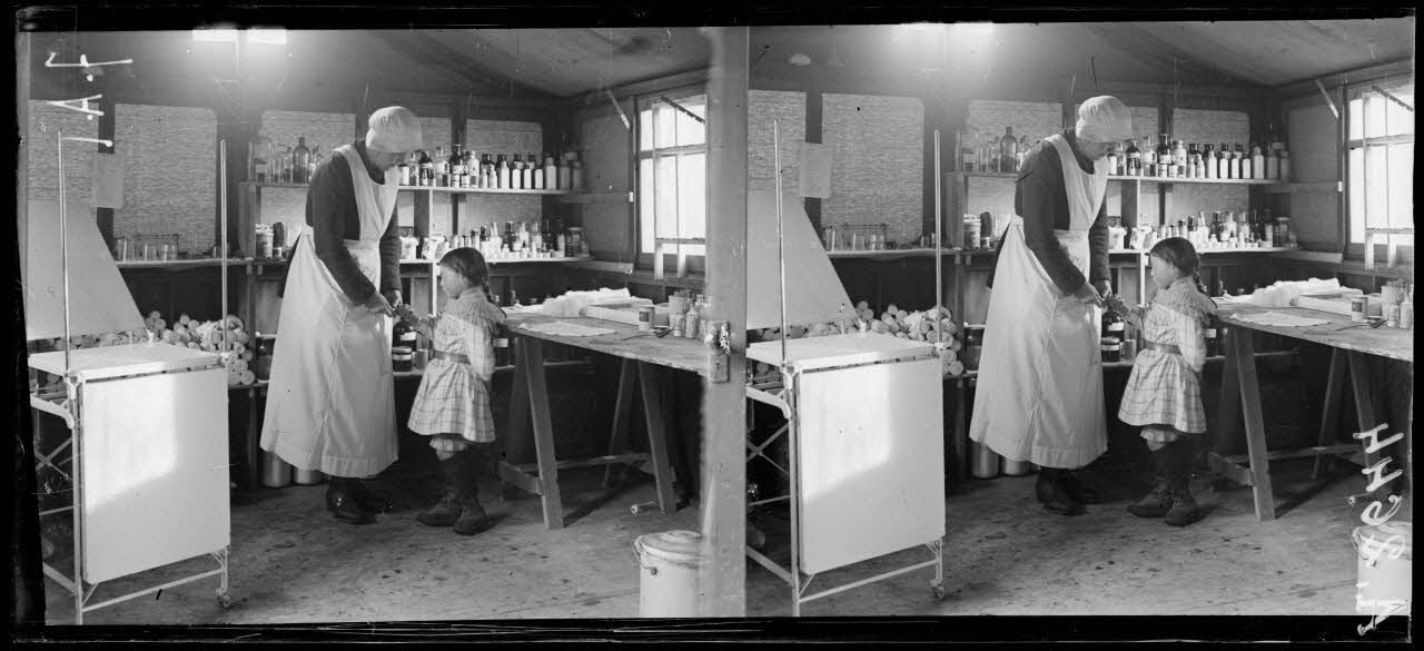 Grécourt, Somme, intérieur du dispensaire du Smith College, infirmière pansant une enfant. [Légende d'origine]