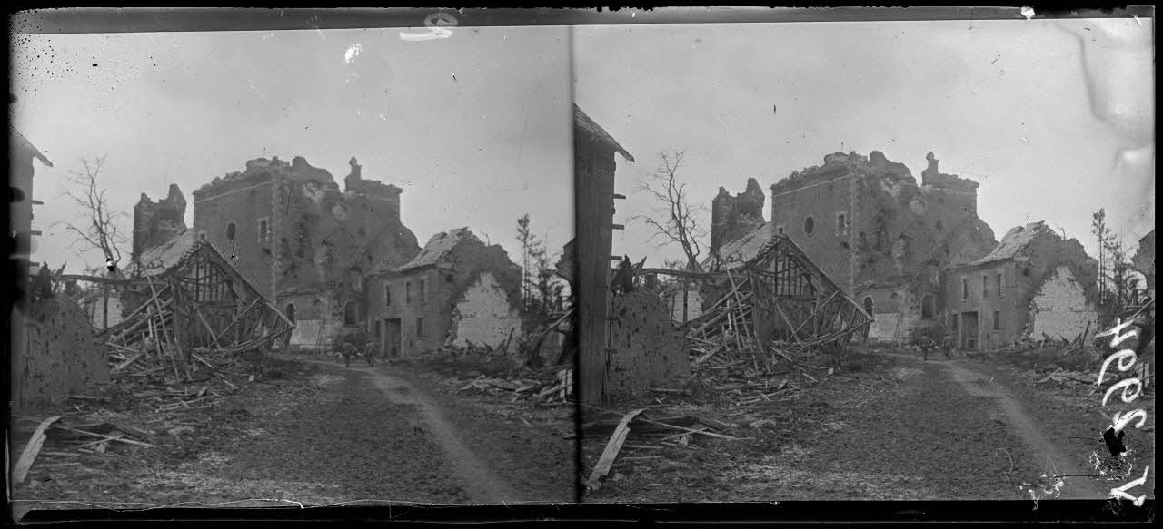 - Dans Montdidier (10/08/1918, V 2966 à V 2986) les troupes de la 60e DI occupe la ville entièrement dévastée. L'église, le palais de Justice et la mairie sont entièrement détruits. La place Parmentier est également dévastée, ainsi que la majorité des habitations.
