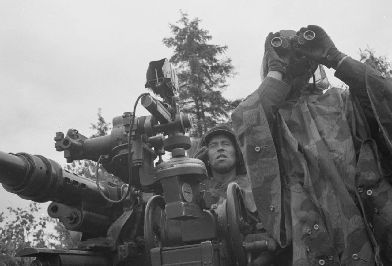 Les servants de cette pièce de 3,7 cm FlaK sont guidés par un télémètre portatif. Un fusil russe capturé Tokarev Svt 40 est comparé au pistolet-mitrailleur allemand MP-40. Dans une tranchée, un reporter de la 1re compagnie de propagande de l'armée de l'air est parmi des fantassins de l'armée de l'air allemande (DAA 2126 L04), on note son appareil photographique Leica. La pièce de DCA est par la suite démontée puis attelée pour le transport.
