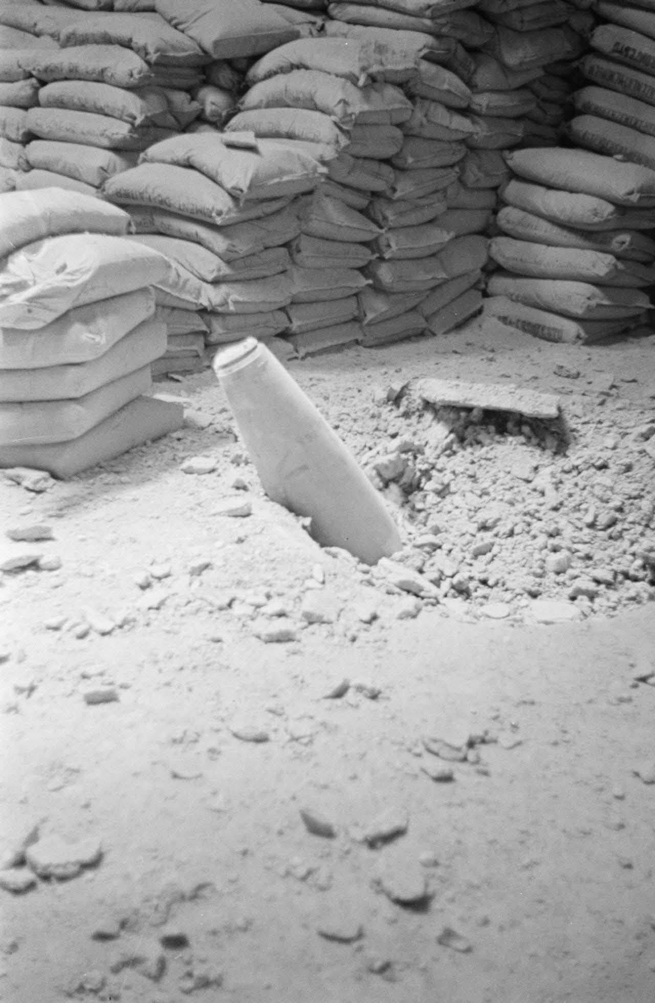 Gros plan sur une bombe alliée qui n'a pas explosé en traversant le toit d'un hangar et en touchant le sol, des sacs de sable sont positionnés autour de l'objectif.