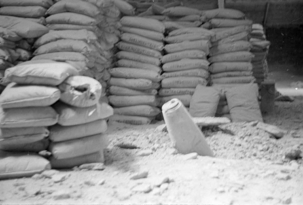 Gros plan sur une bombe alliée qui n'a pas explosé en traversant le toit d'un hangar et en touchant le sol, des sacs de sable sont positionnés autour de l'objectif.