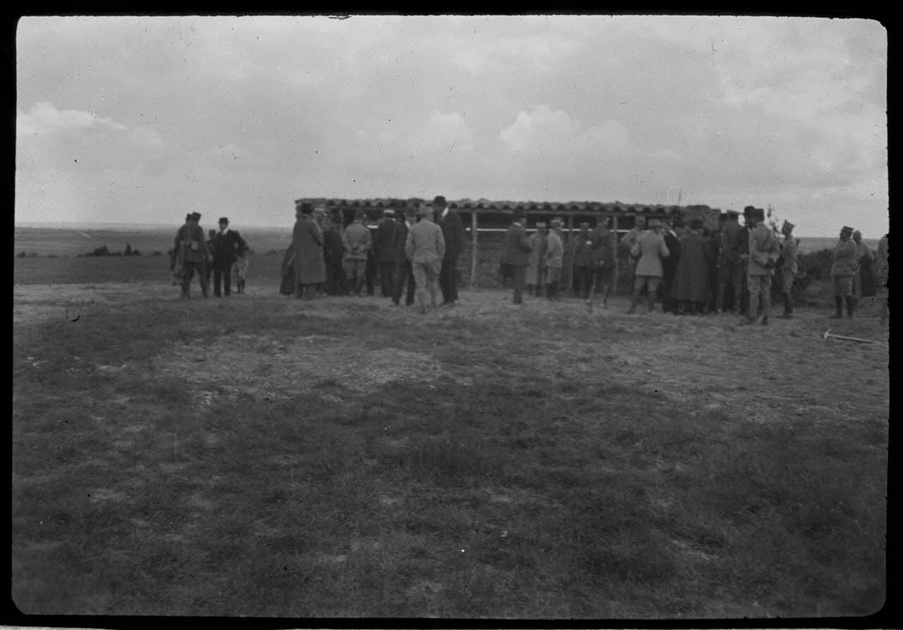[Groupe d'autorités civiles et militaires sur un terrain de Mailly-le-Camp lors d'une visite officielle, s.d.]