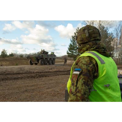 Un officier de liaison estonien observe un exercice de combat débarqué en VBCI (véhicule blindé de combat d'infanterie) avec séance de tir des légionnaires de la 1re section de la 5e compagnie du 2e REI (régiment étranger d'infanterie), sur le champ de tir en Lettonie.