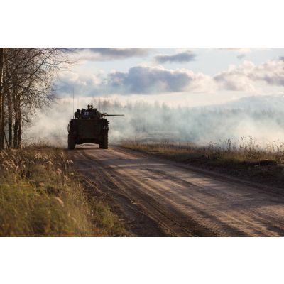 Progression d'un VBCI (véhicule blindé de combat d'infanterie), lors d'un exercice de combat débarqué avec séance de tir des légionnaires de la 1re section de la 5e compagnie du 2e REI (régiment étranger d'infanterie), sur le champ de tir en Lettonie.