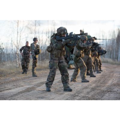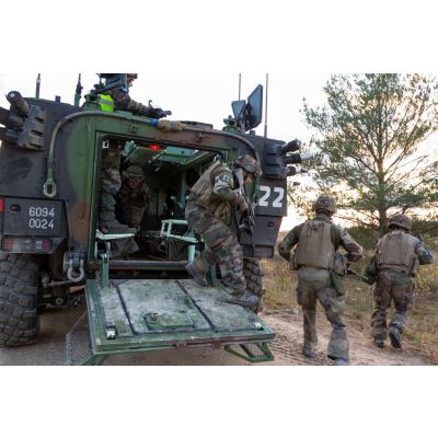 Exercice de combat débarqué avec séance de tir des légionnaires de la 1re section de la 5e compagnie du 2e REI (régiment étranger d'infanterie), sur le champ de tir en Lettonie. Débarquement des légionnaires équipés de FAMAS d'un VBCI (véhicule blindé de combat d'infanterie).