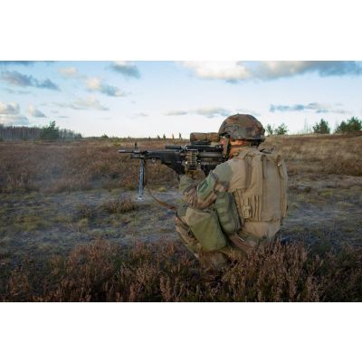 Exercice de combat débarqué avec séance de tir des légionnaires de la 1re section de la 5e compagnie du 2e REI (régiment étranger d'infanterie), sur le champ de tir en Lettonie. Un légionnaire en position de tir à la FN Minimi.