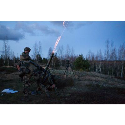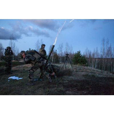 Tir de mortier de 81 mm LLR (léger long renforcé de 5000 mètres de portée) lors d'un exercice mené par les légionnaires de la 1re section de la 5e compagnie du 2e REI (régiment étranger d'infanterie), sur le champ de tir en Lettonie.