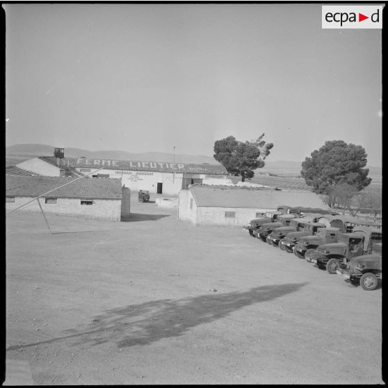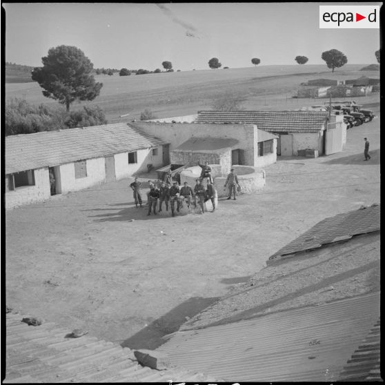 Ces soldats du 14e bataillon de tirailleurs (14e BT) sont cantonnés dans la ferme Lieutier. Ils posent devant le puits de la cour de la ferme. En arrière-plan, derrière un des bâtiments du corps de ferme, des véhicules légers de type GMG 6x6 sont stationnés.