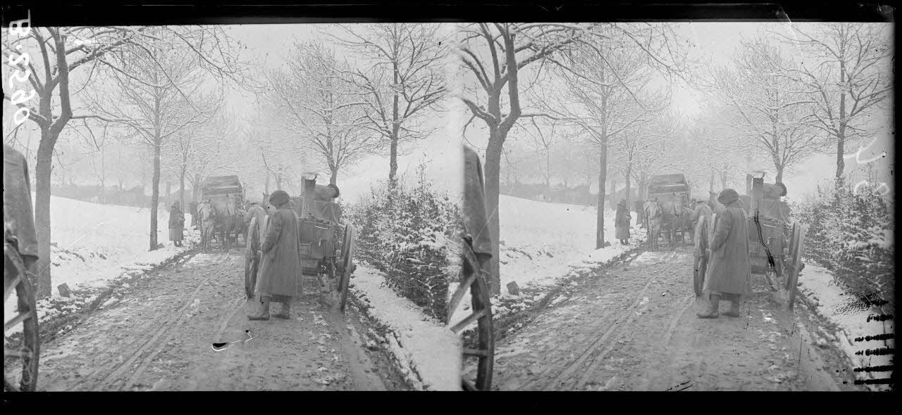 Dans des endroits non localisés, il photographie notamment : une famille alsacienne en traîneau, la réparation d'un pont, un central téléphonique, une vieille femme portant du bois, des enfants balayant la neige, une corvée de charbon, un ambulancier à cheval, des soldats équipés contre le froid.