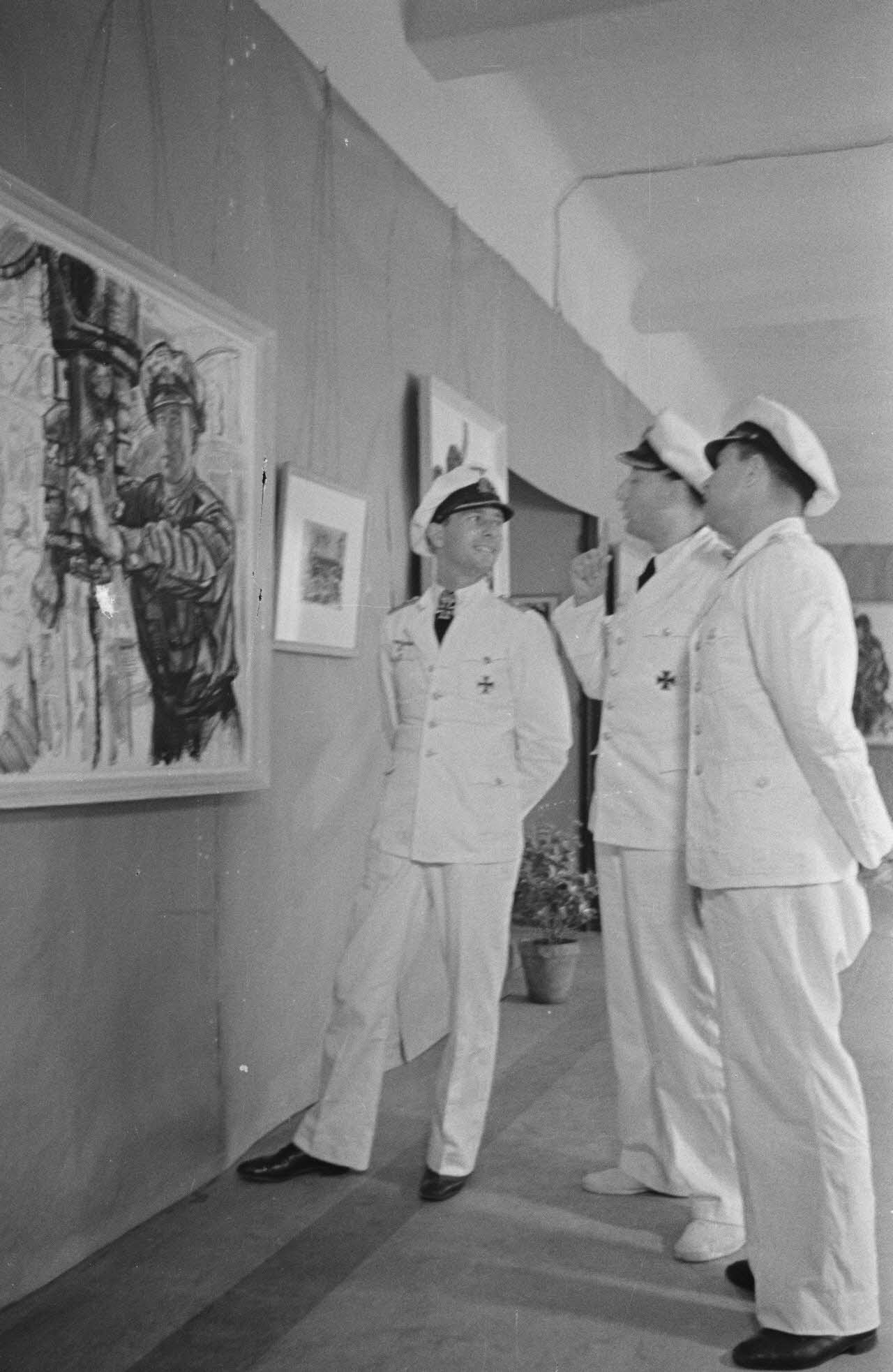 Guidé par les reporters Heinrich Schwich et Lothar-Günther Buchheim, le Kapitänleutnant Herbert Kuppisch visite une exposition de dessins et de peintures à l'hôtel Royal de La Baule.
