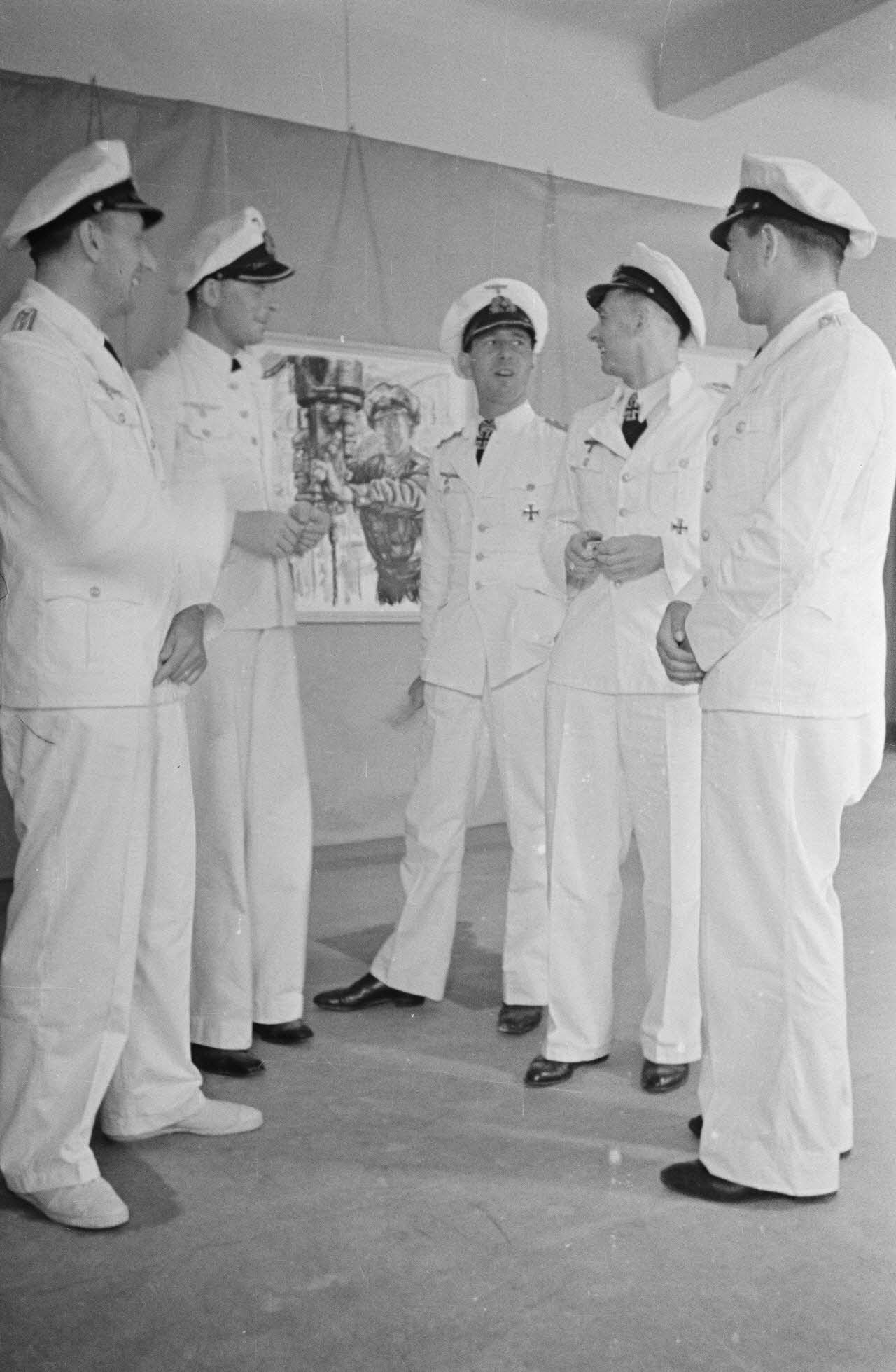 Les commandants de sous-marins Engelbert Endrass, Claus Korth, Heinrich Lehmann-Willenbrock, Erich Topp et Herbert Kuppisch visitent une exposition de dessins et de peintures.