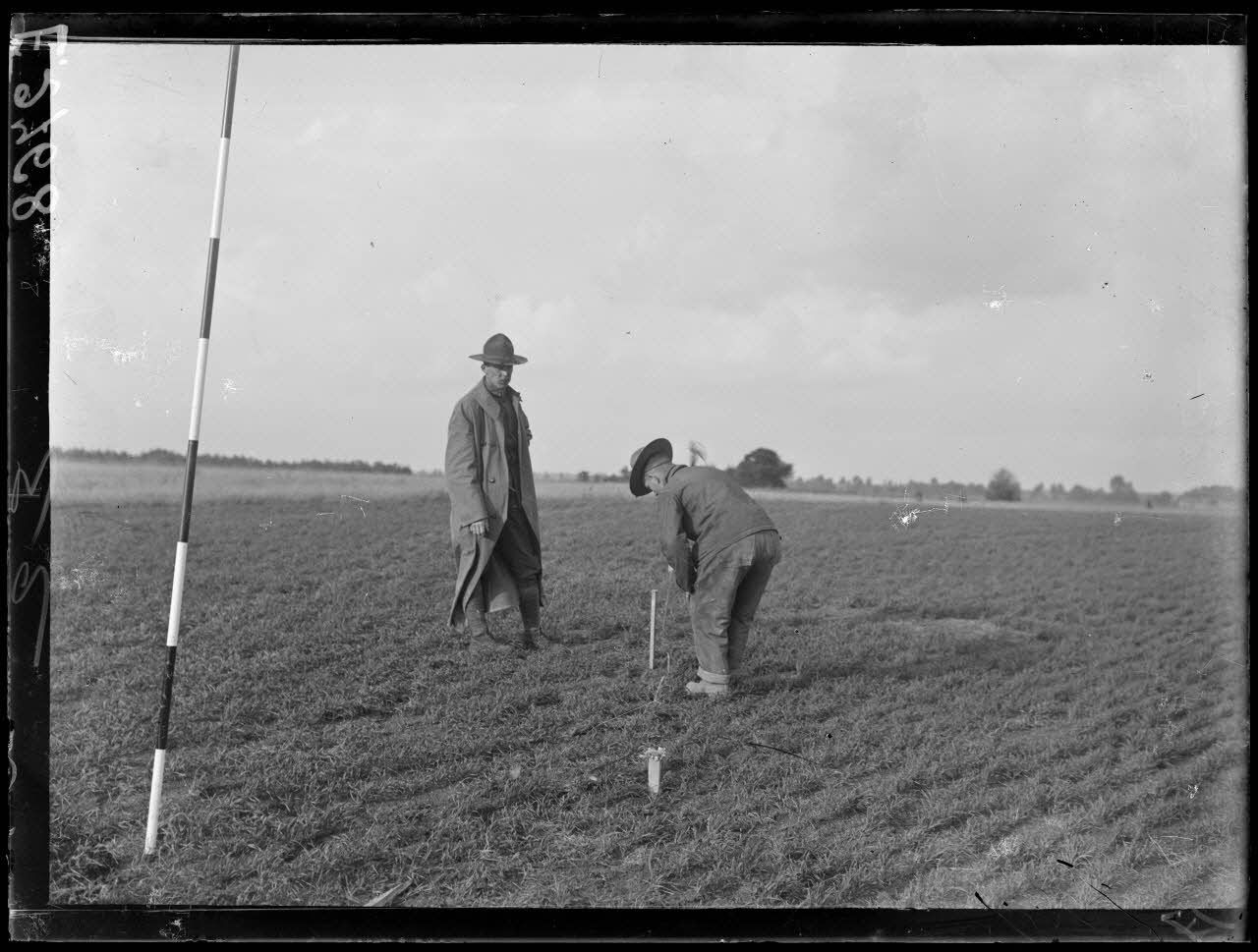 Haussimond (Marne). Construction d'un camp par les Américains. Géomètres au travail.