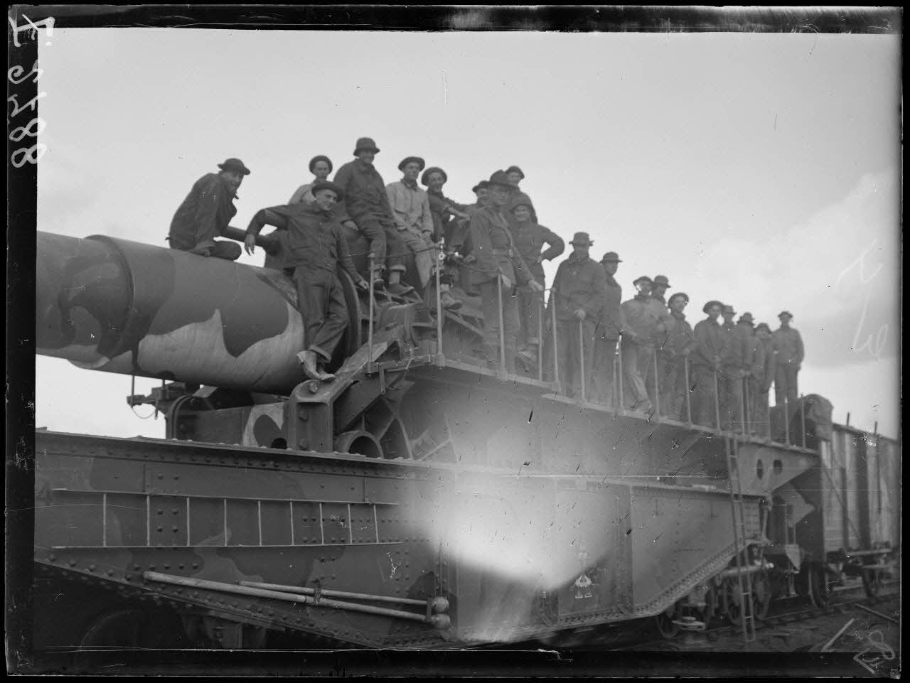 Haussimont (Marne). Instruction du canon de 400 mm. Groupe d'américains sur le canon de 400.
