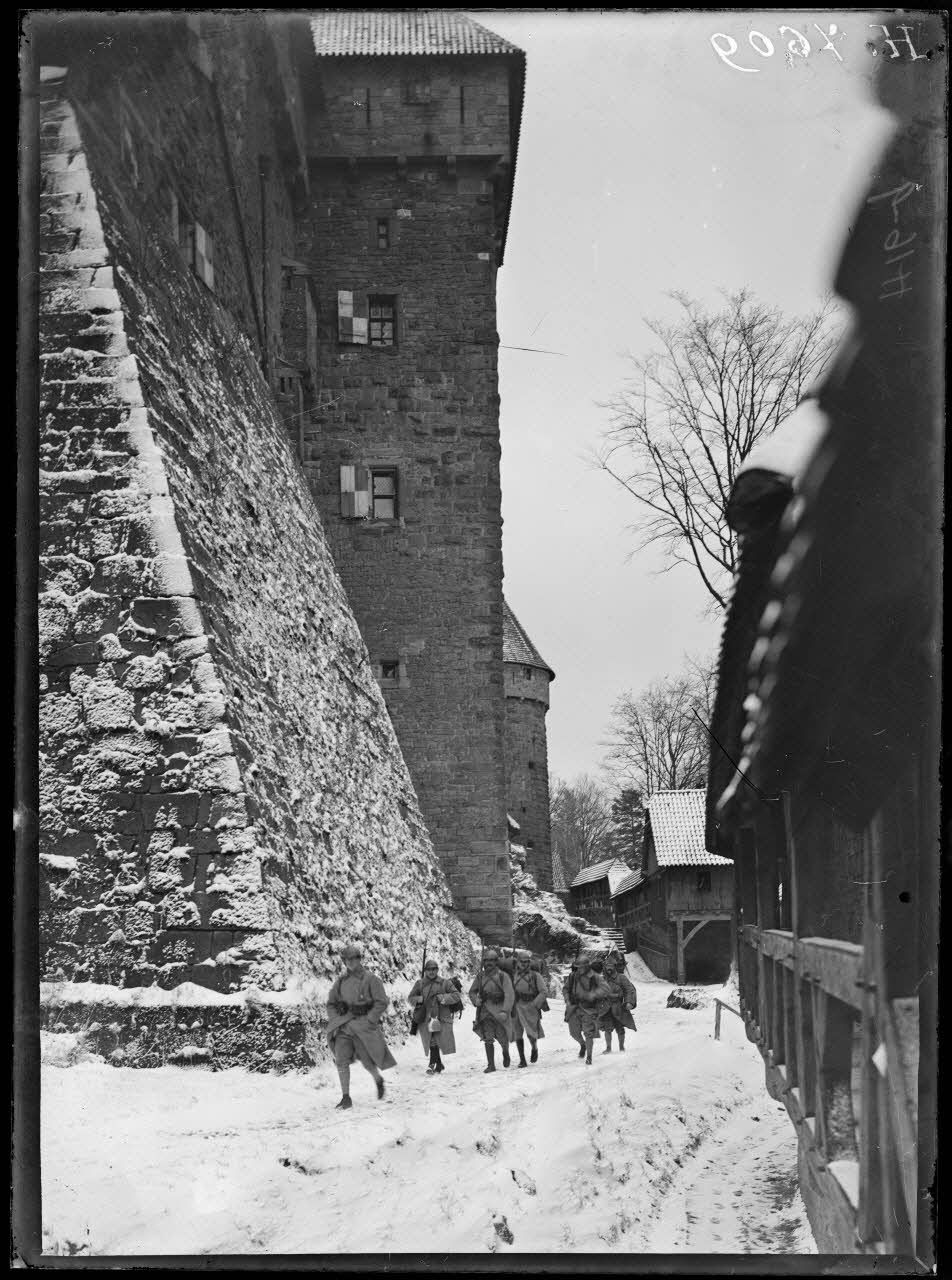 - La sortie de la messe dans la ville de Kaysersberg. Devant l'église se trouve la fontaine Barberousse. D'anciennes tranchées allemandes ont été creusées près de la tour du château. Un panorama du village permet d'observer la Weiss.