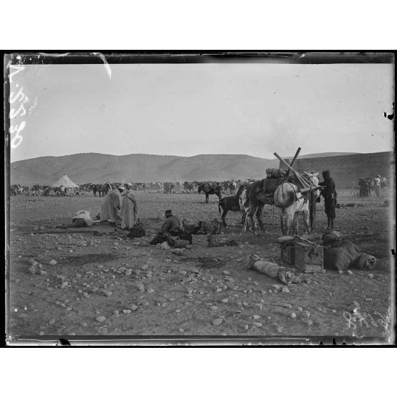 Opérations militaires sur la Haute Moulouya (Maroc). Les mulets de l'intendance à Tafagourt.