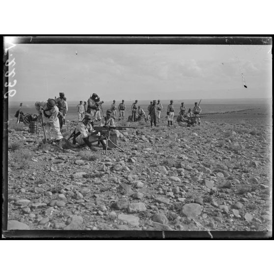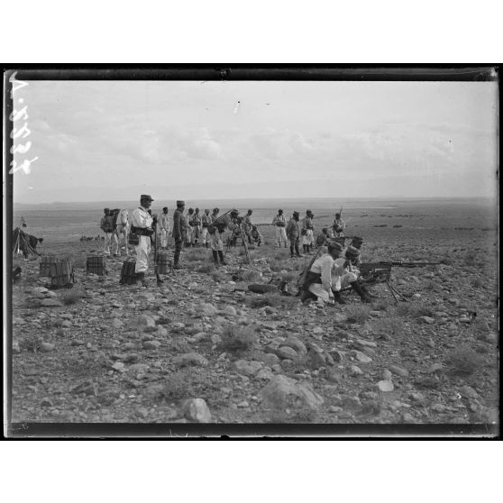Plaine de la Moulouya. Section de mitrailleuses gardant la nouvelle route.