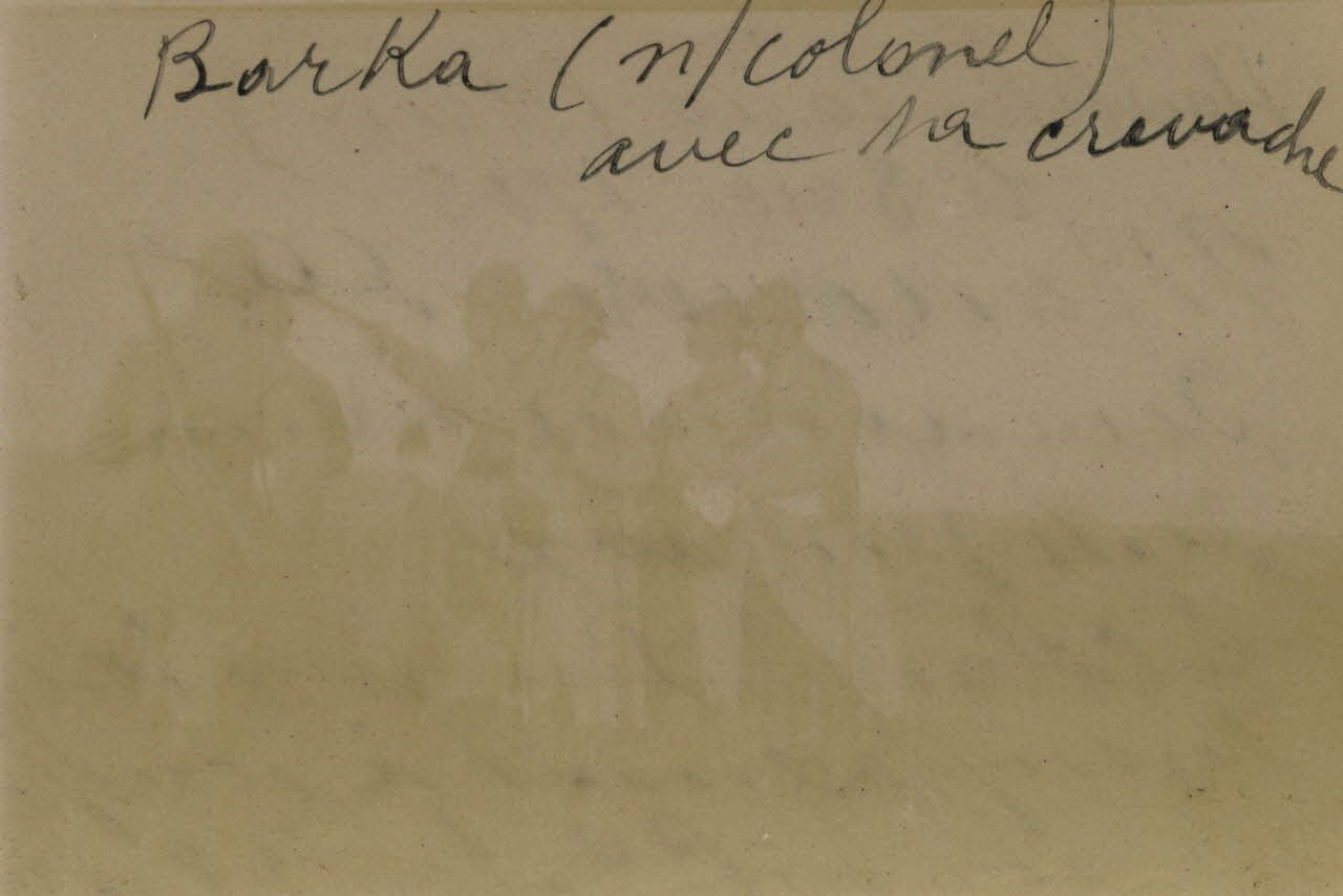 Hautefontaine (Aisne), le 8 novembre 1915. Manoeuvre de [illisible] en présence des 4 généraux. Le colonel Puntous désigne les emplacements à occuper au commandant, les capitaines et chef de bataillon. Barka (notre colonel) avec sa cravache. [légende d'origine]