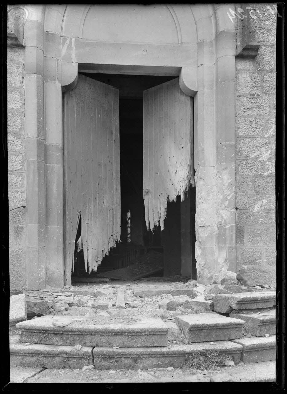 Hénaménil (Meurthe-et-Moselle). Entrée de l'église. Porte déchiquetée par les balles. [légende d'origine]