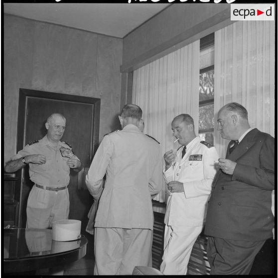 Le général Raoul Salan s'entretient avec Henri Fouques-Duparc et le général Réthoré, au ministère de l'Algérie, à Alger.
