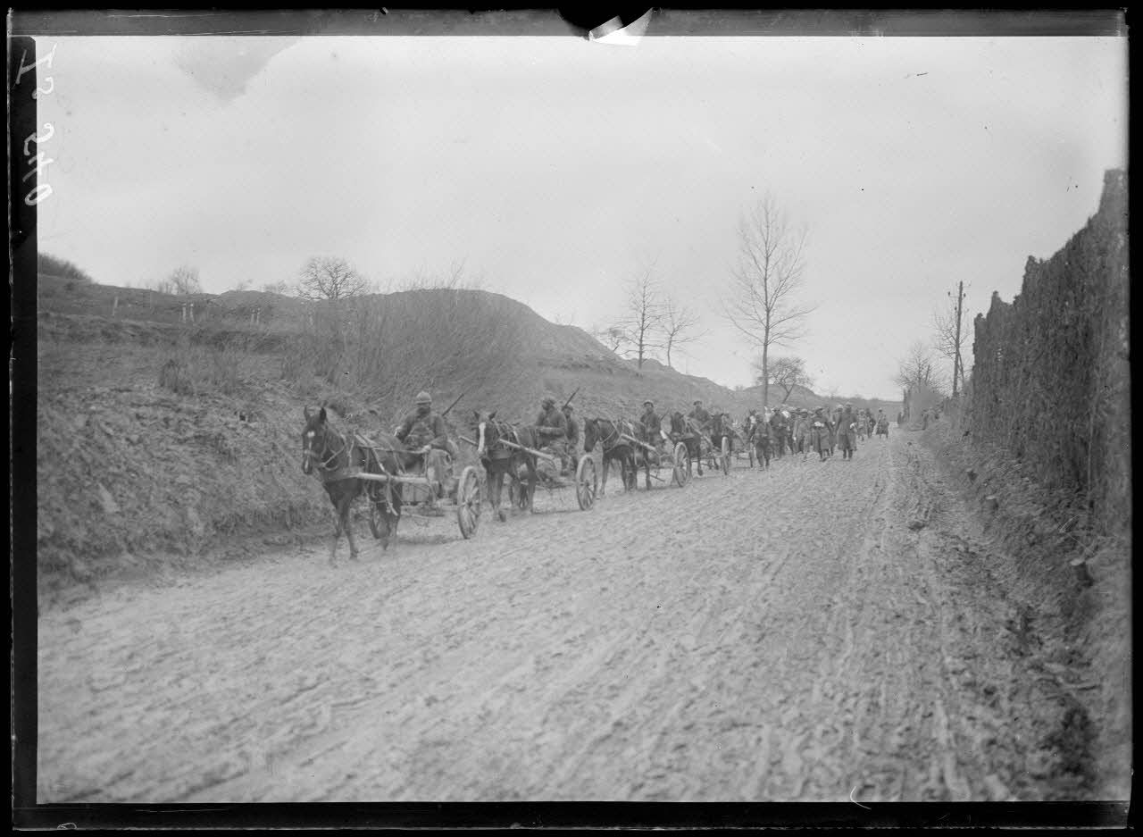 Région de la Vesle, artillerie lourde française et arrivée des premiers prisonniers allemands du Chemin des Dames, avril 1917.