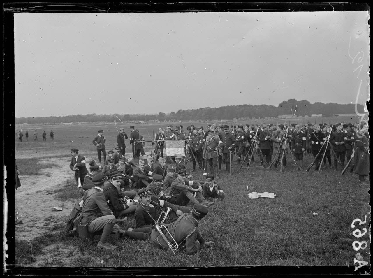 Hippodrome de Vincennes. Revue des sociétés de préparation militaire. Mise en batterie de pièces de 75.