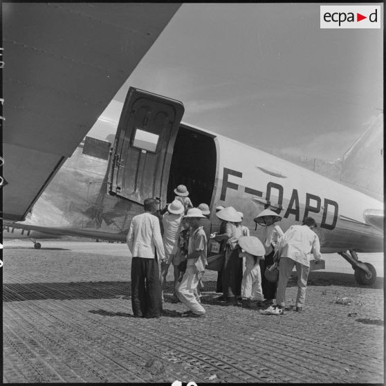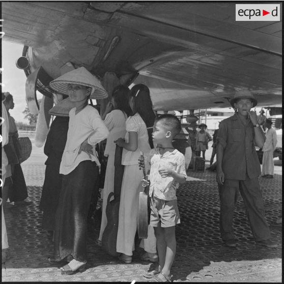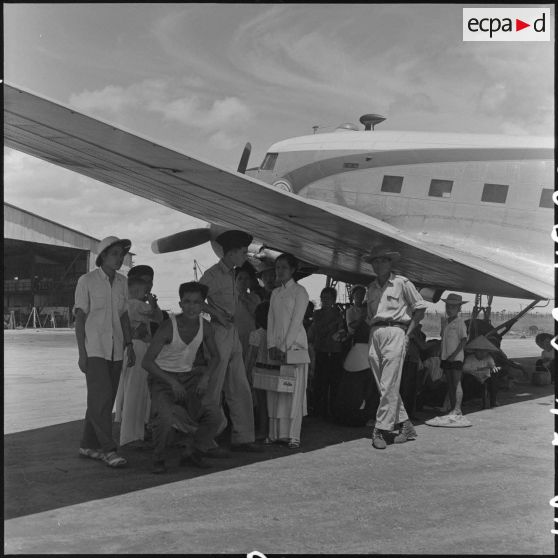 Groupe de civils sur le tarmac d'un aérodrome lors de l'évacuation de la population du Nord-Vietnam par le pont aérien Hanoï-Saigon.