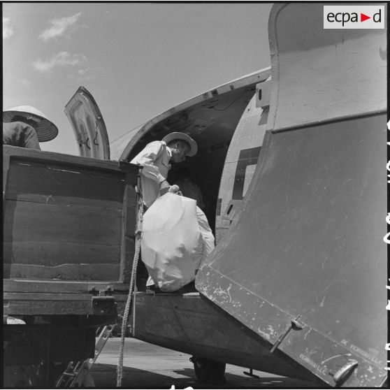 Chargement de bagages dans la soute d'un avion du pont aérien Hanoï-Saigon.