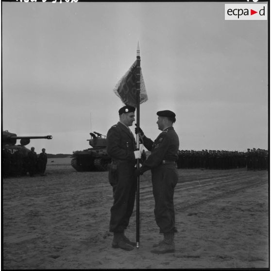 Le général Huet, commandant la 7e division mécanisée rapide (DMR), remet son fanion à l'unité territoriale blindée A-199 (UTBA 199).