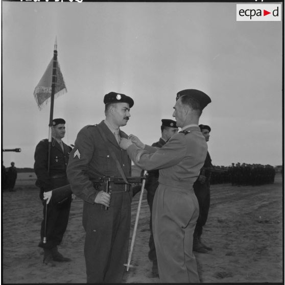 Hussein Dey. Camp du Lido. Le général Huet remet la croix de la valeur militaire au maréchal des logis chef.