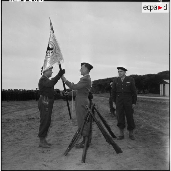 Hussein Dey. Camp du Lido. Le général Huet remet son fanion au capitaine Léger.