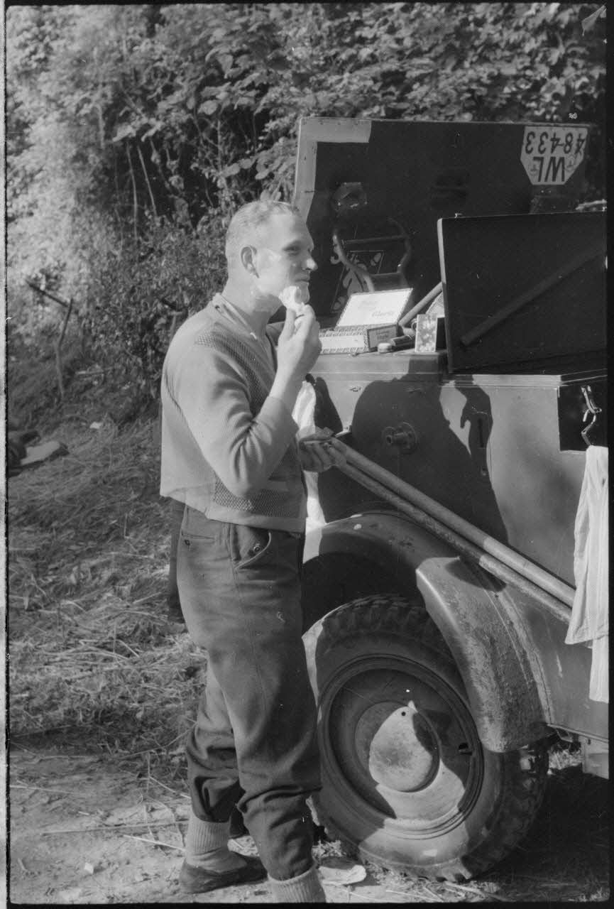 Hygiène du matin, en arrière-plan l'insigne du 2e corps de DCA (II. Flakkorps).