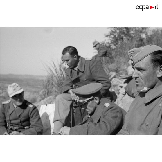 Un groupe d'officiers allemands de la 21e division blindée allemande (21-Panzer Division) est réuni au sommet d'une colline.