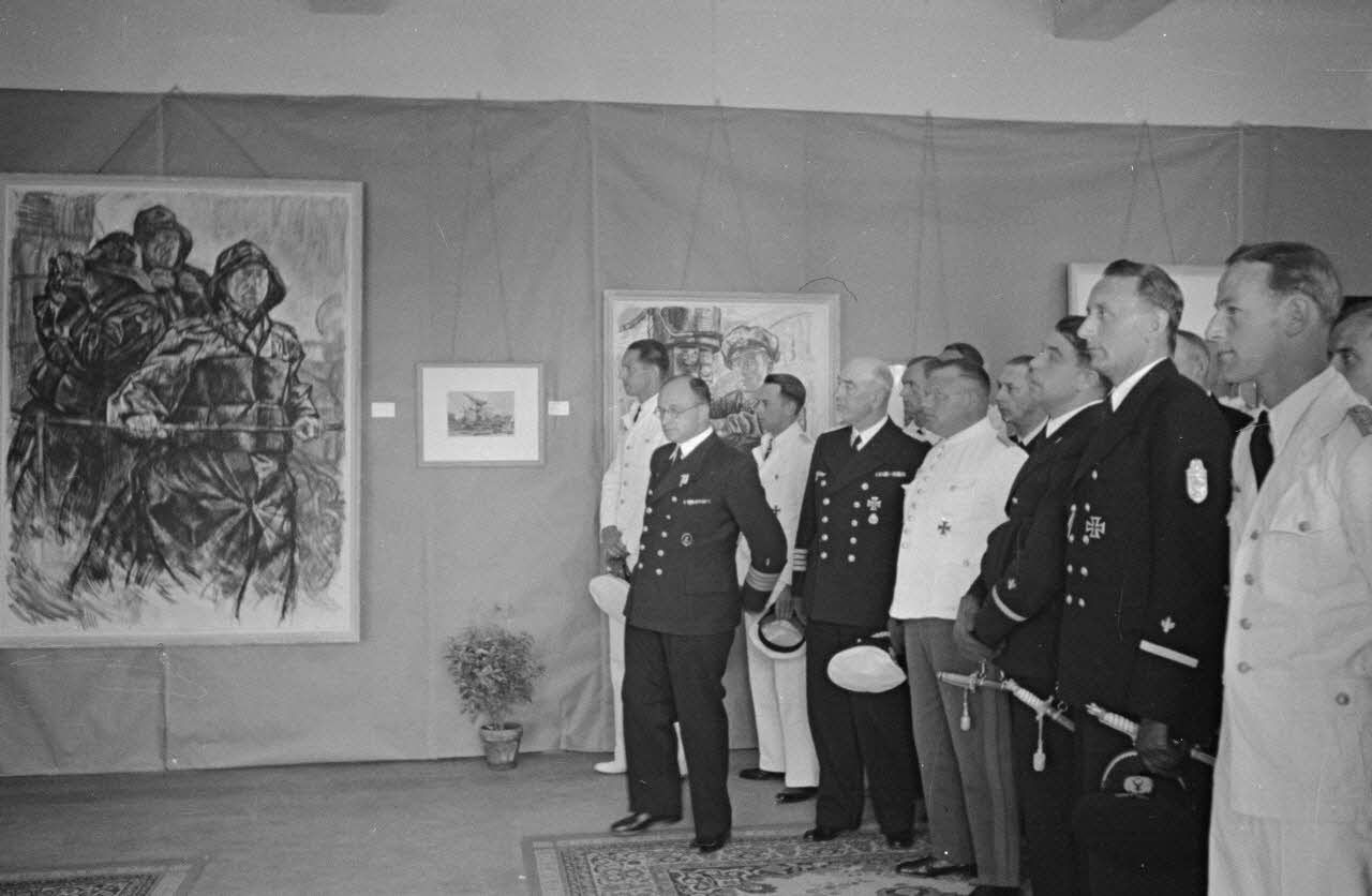 Lors de l'inauguration d'une exposition de dessins réalisés par les peintres de guerre (Kriegsmaler), le reporter Lothar-Günther Buchheim présente son travail aux autorités de la Kriegsmarine.