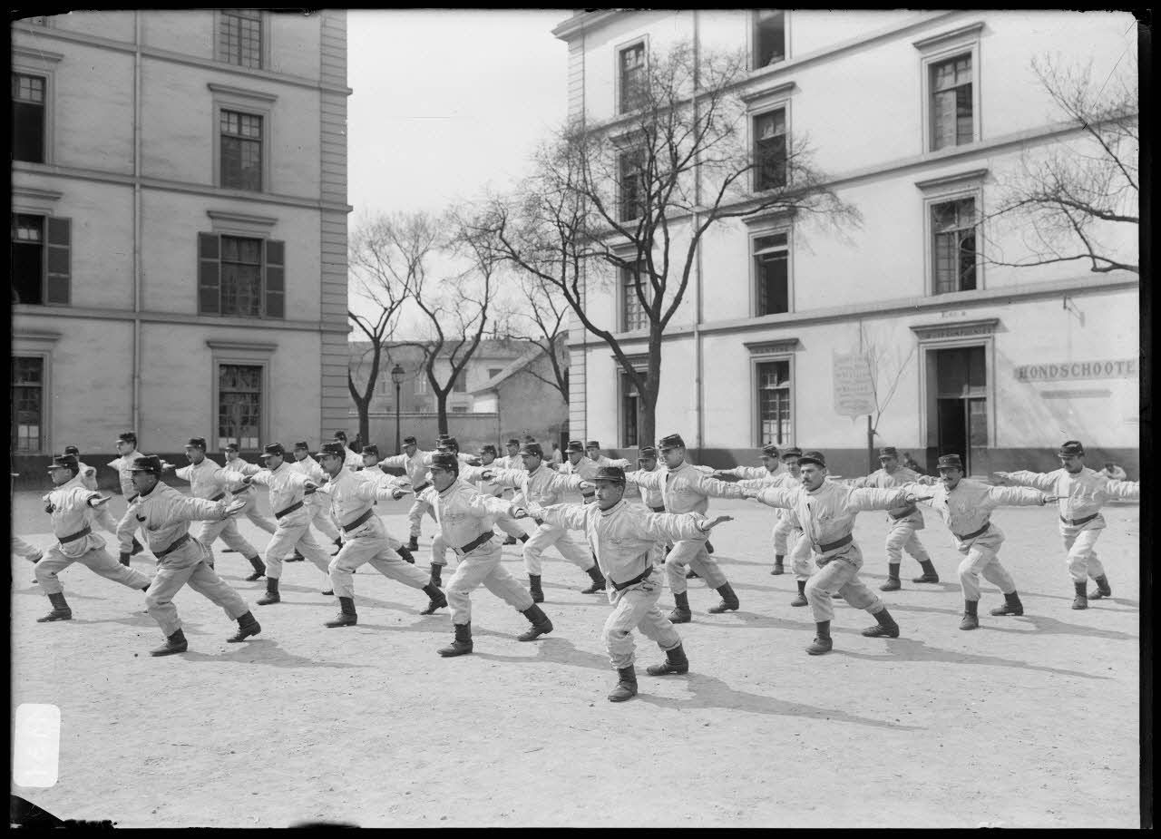 Infanterie - La gymnastique pour les soldats du 89e RI dans la cour de la caserne. [légende d'origine]