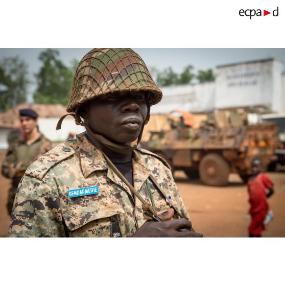 Gendarme centrafricain en faction lors de l'inspection de la brigade de gendarmerie de Bambari par monsieur Nicaise Karnou-Samedi, ministre de la sécurité et le lieutenant-colonel Guy-Bertrand Damango, directeur général de la gendarmerie nationale.