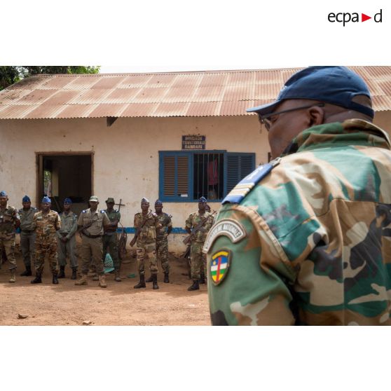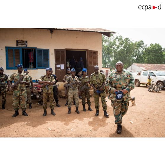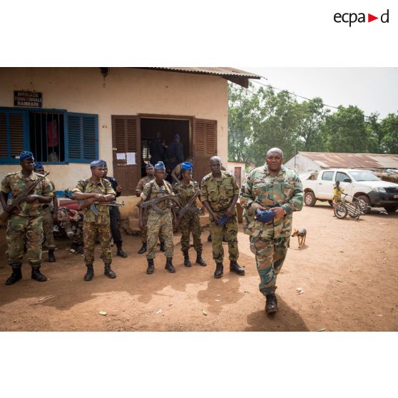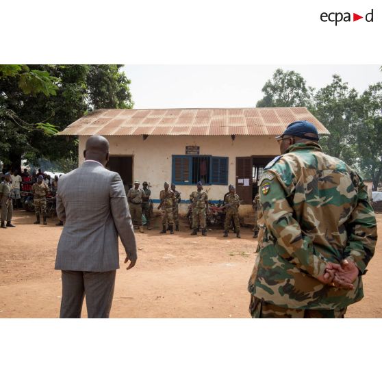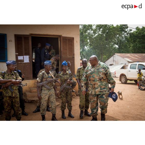 Le lieutenant-colonel Guy-Bertrand Damango, directeur général de la gendarmerie nationale centrafricaine, passe ses troupes en revue lors de l'inspection de la brigade de gendarmerie de Bambari par monsieur Nicaise Karnou-Samedi, ministre de la sécurité.