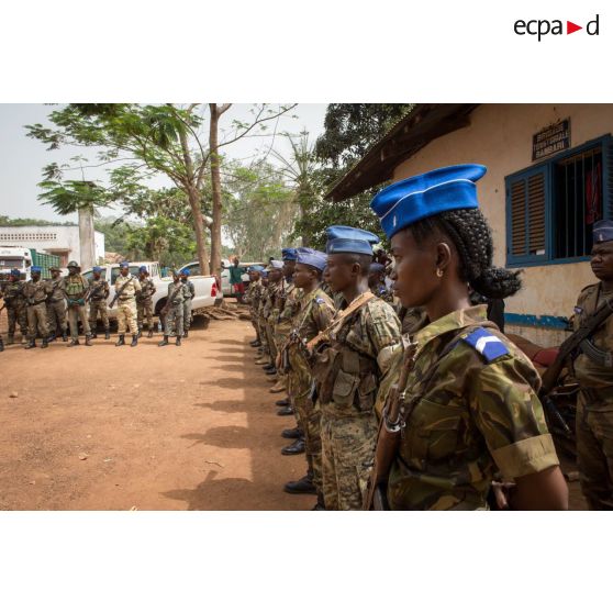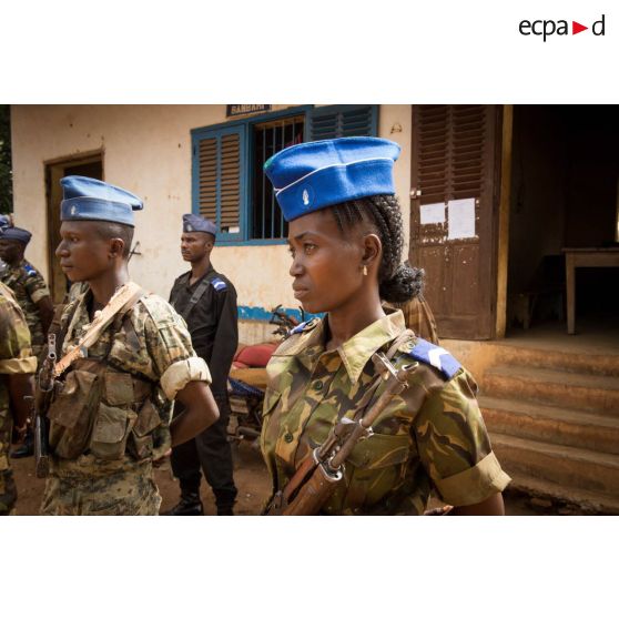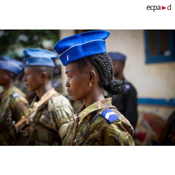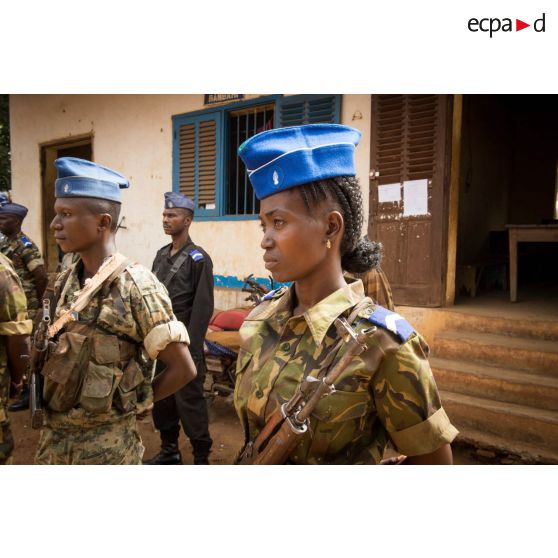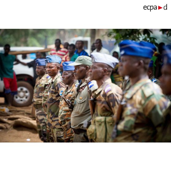 Gendarmes centrafricains en rang lors de l'inspection de la brigade de gendarmerie de Bambari par monsieur Nicaise Karnou-Samedi, ministre de la sécurité et le lieutenant-colonel Guy-Bertrand Damango, directeur général de la gendarmerie nationale.