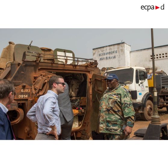 Le lieutenant-colonel Guy-Bertrand Damango, directeur général de la gendarmerie nationale centrafricaine converse avec des civils à l'arrière d'un VAB, lors de l'inspection de la brigade de gendarmerie de Bambari par monsieur Nicaise Karnou-Samedi, ministre de la sécurité.