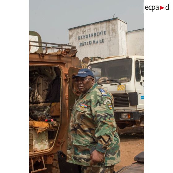 Le lieutenant-colonel Guy-Bertrand Damango, directeur général de la gendarmerie nationale centrafricaine se tient à l'arrière d'un VAB, lors de l'inspection de la brigade de gendarmerie de Bambari par monsieur Nicaise Karnou-Samedi, ministre de la sécurité.
