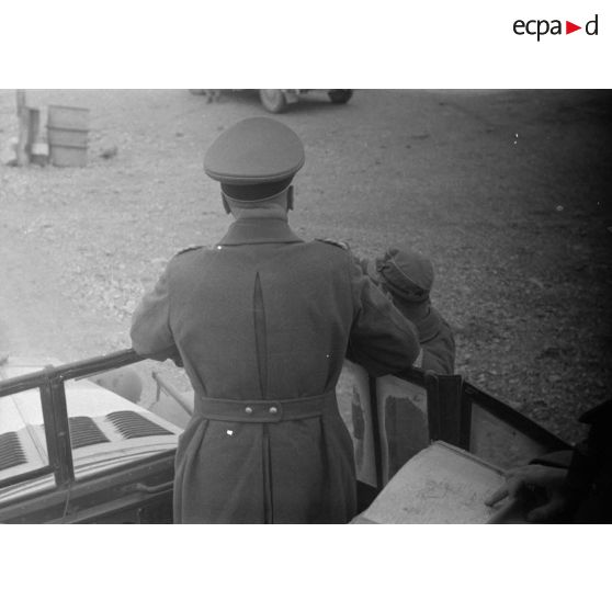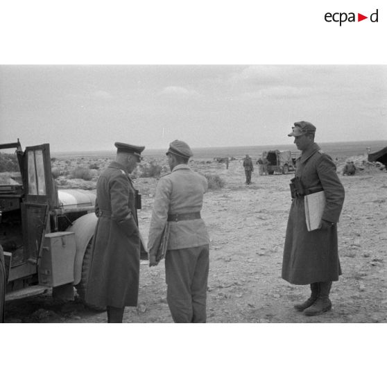 Le général Crüwell descendu de son véhicule, parle avec un officier, tandis qu'un autre attend des cartes sous le bras.