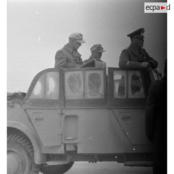 Le général Crüwell, de dos, dans la voiture Kfz-16.