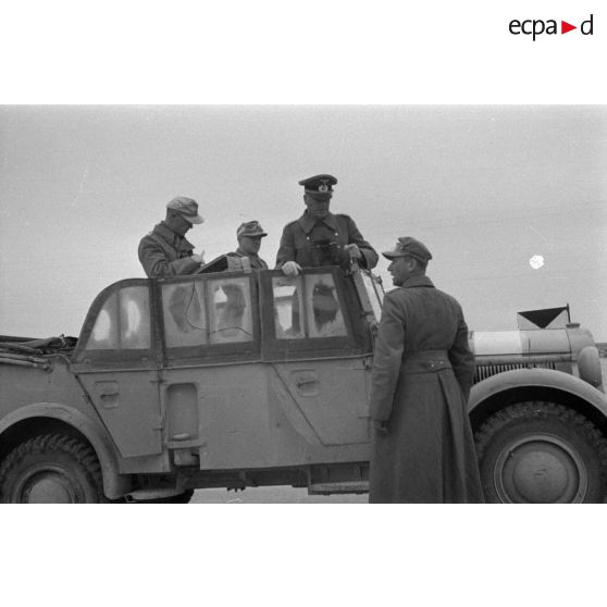 Le général (General der Panzertruppe) Crüwell debout dans sa voiture Kfz-16 parle avec un officier à l'extérieur du véhicule.