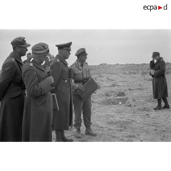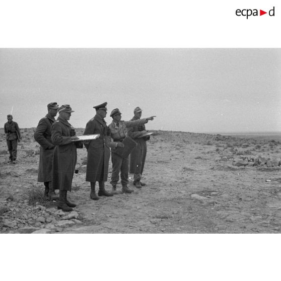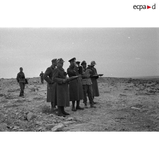Le général Crüwell observe le terrain en compagnie d'officiers.