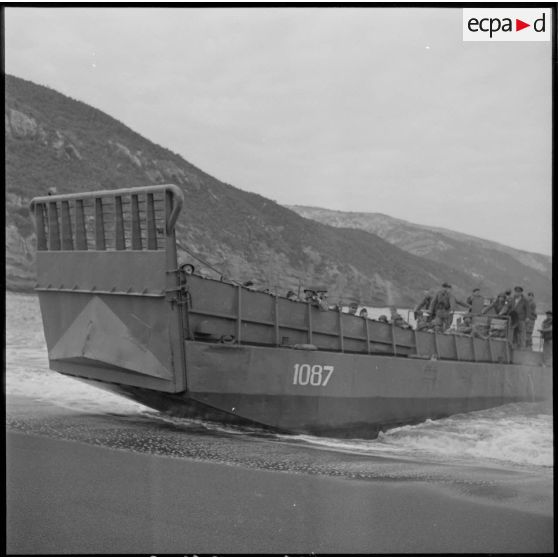 Débarquement du 19e bataillon de chasseurs à pieds (BCP) à Honaïne à bord d'un bâtiment LCM (Landing craft Material).