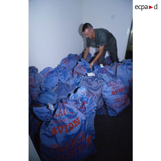 Un soldat décharge des sacs de courrier de la poste aux Armées à l'EMIA (état-major interarmées) de Ryad.